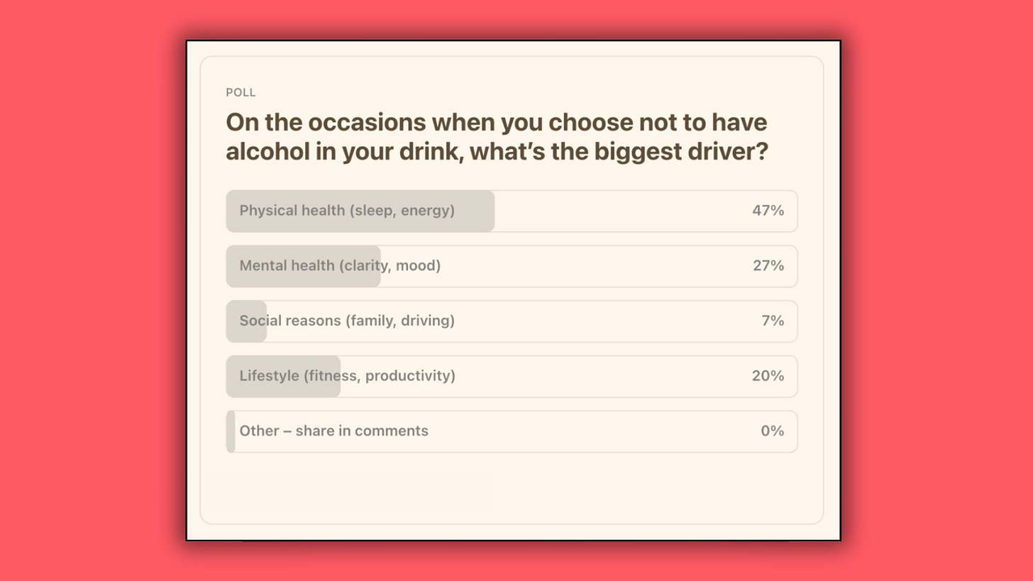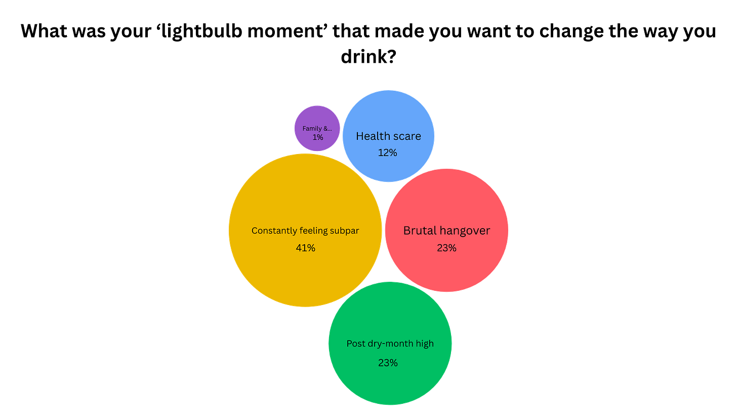 And when I asked about your lightbulb moment - that thing that made you think “right, time to drink differently” - the winner by a mile was “constantly feeling sub-par” at 41%. Not a serious health scare or intervention-level drama. Just the slow dawning realisation that you’re tired of feeling a bit rubbish all the time - exactly the path that brought me here today.