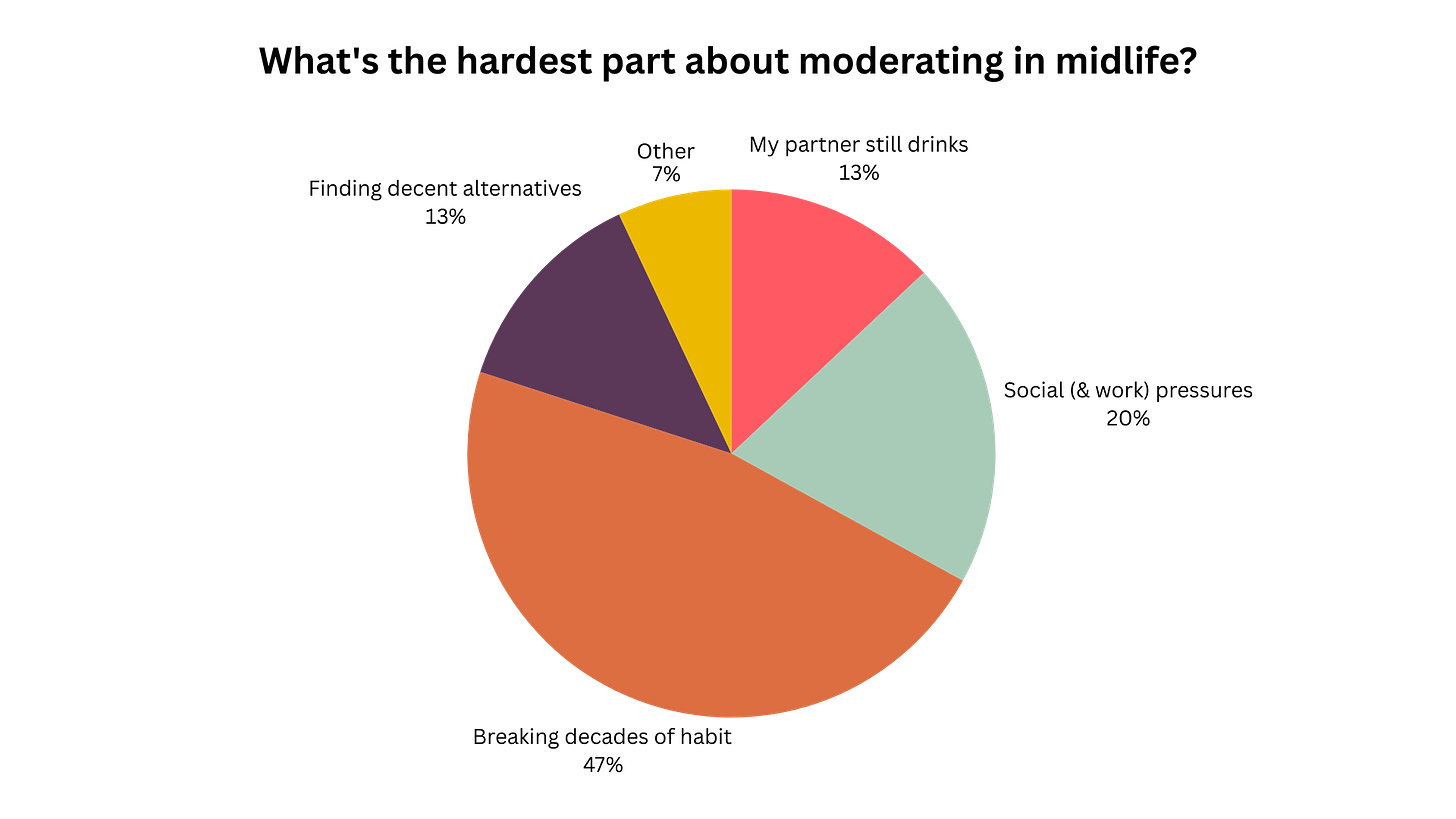 When I asked what’s hardest about moderating in midlife, 47% of you said breaking decades of habits. Not social pressure or finding decent drinks, not even dealing with a partner who still drinks, just the sheer weight of doing the same thing you’ve done for twenty, thirty, maybe forty years.