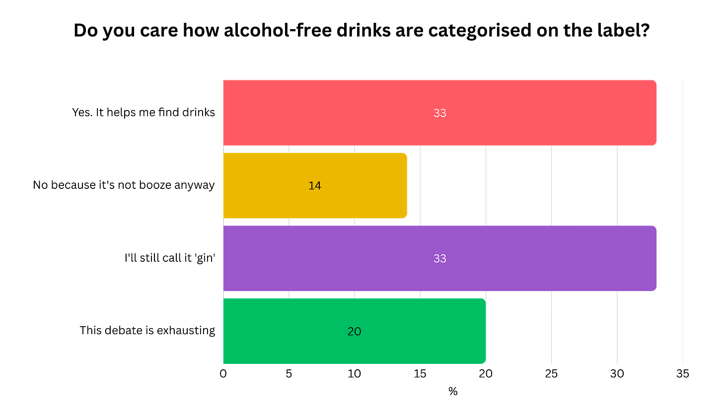 And speaking of labels that people have strong opinions about for no good reason, after the EU ruling that the word ‘gin’ can no longer be used on non-alc drinks, I asked if you care how alcohol-free drinks are categorised on the label.