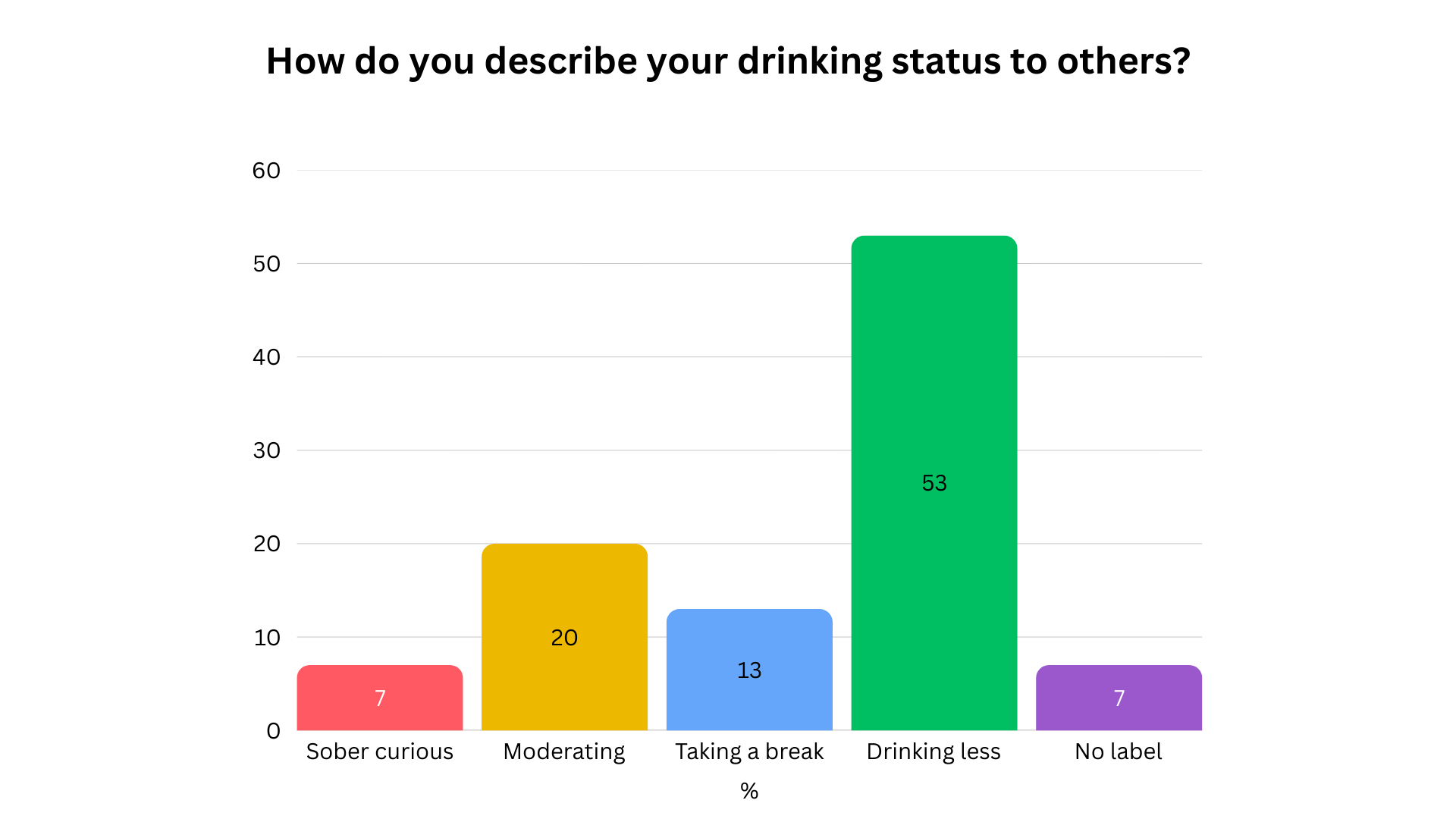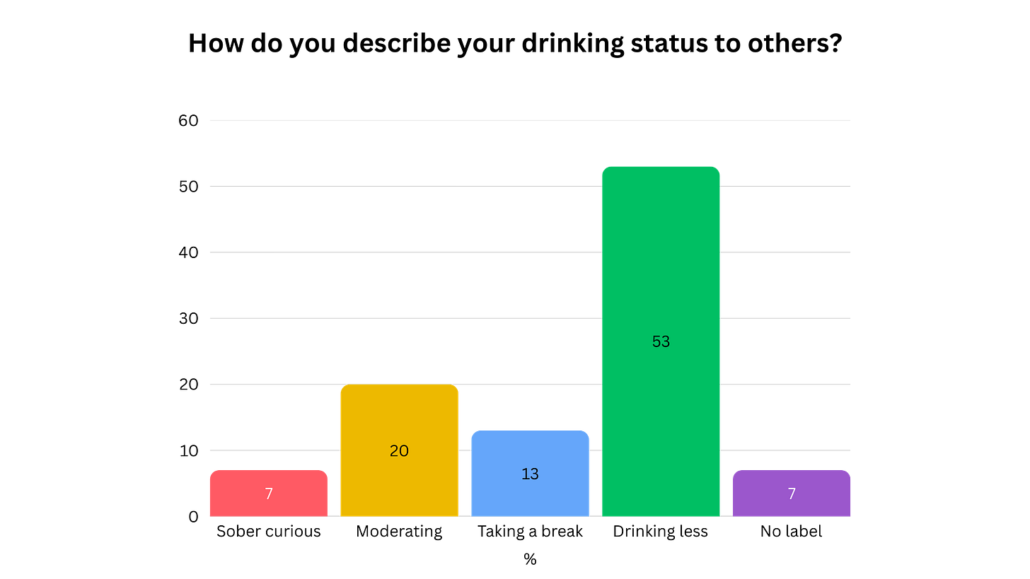 When I asked how you describe your drinking situation to others, 53% of you went with the spectacularly unremarkable “I just drink less now.”