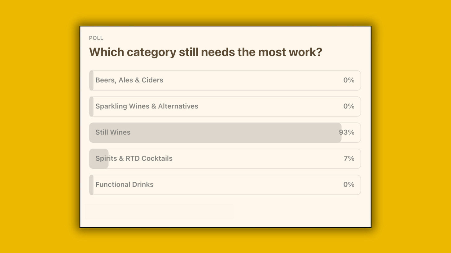 Then I asked which category needs the most work, and you absolutely savaged still wine - 93% of you reckon it’s still rubbish. I mean, I know there’s a lot of work to be done, guys, but still… savage!