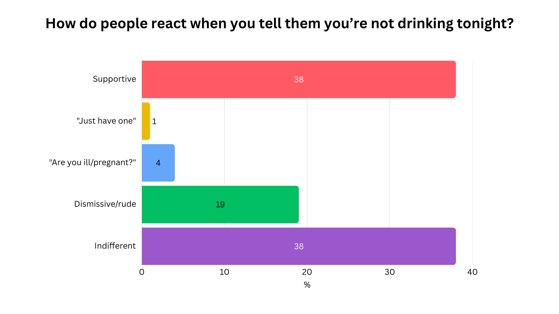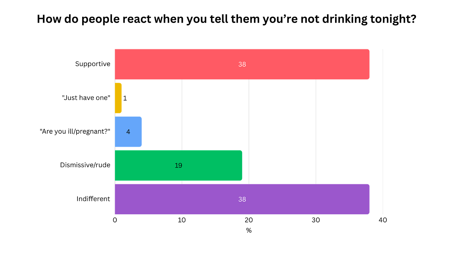 But then, when I asked how people actually react when you tell them you’re not drinking, 38% said supportive, and another 38% said completely indifferent.