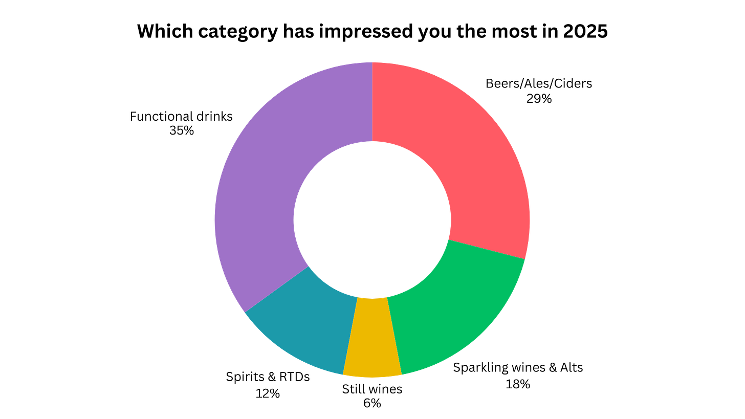 When I asked which category impressed you most in 2025, functional drinks came out on top at 35% - fascinating, as previously 70% said you either didn’t know what they were or were unconvinced by them.